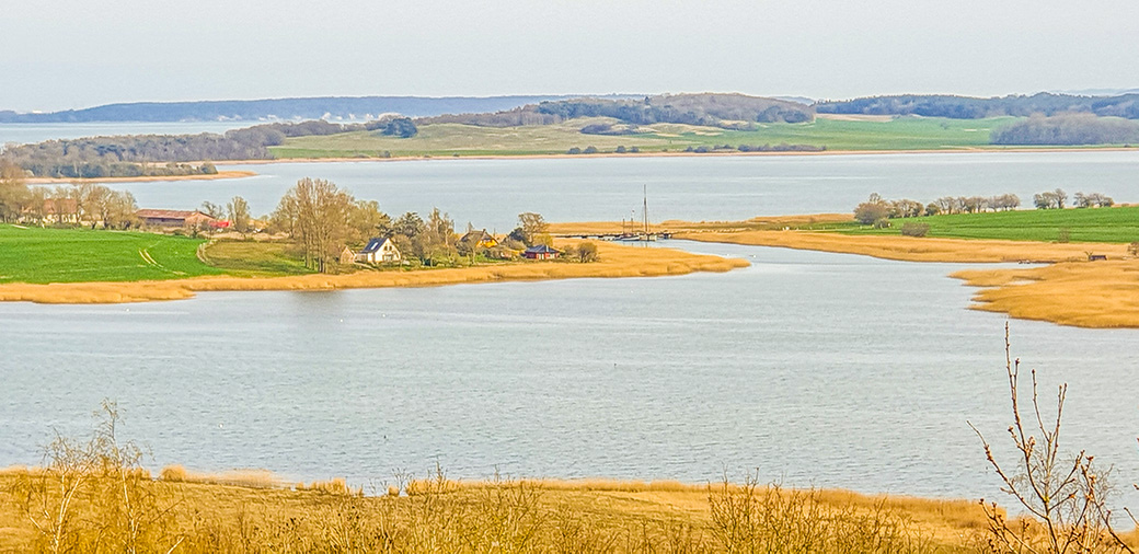 Ein paar Schritte weiter und wir können den herrlichen Blick über die Boddenlandschaft bis nach Stralsund genießen. Beim Vogelzug auch ein ruhiger Platz, um die Kraniche morgens und Abends beim Flug zu beobachten.