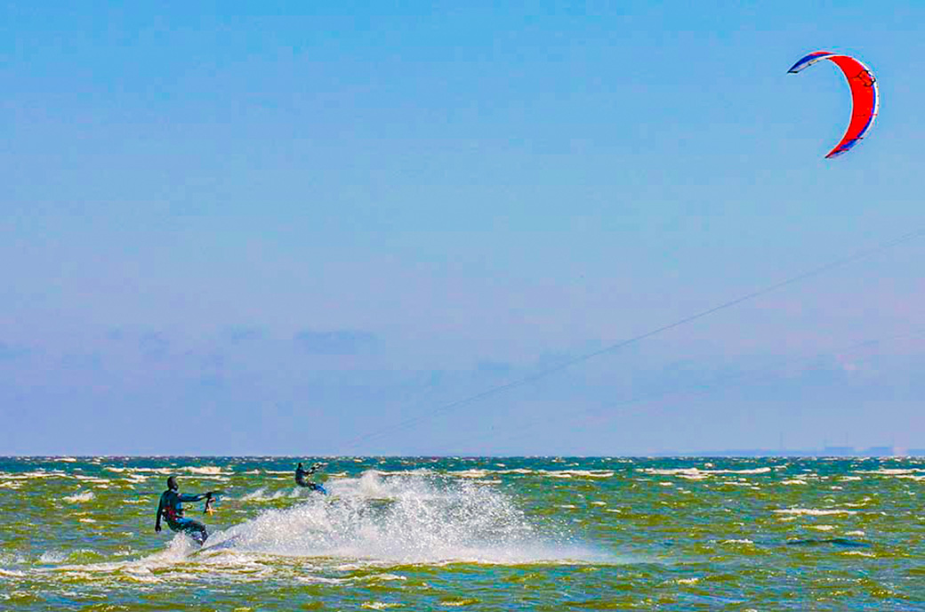 Die große Bucht mit Flachwasserbereichen bietet gute Voraussetzungen für Surfer und Kiter.