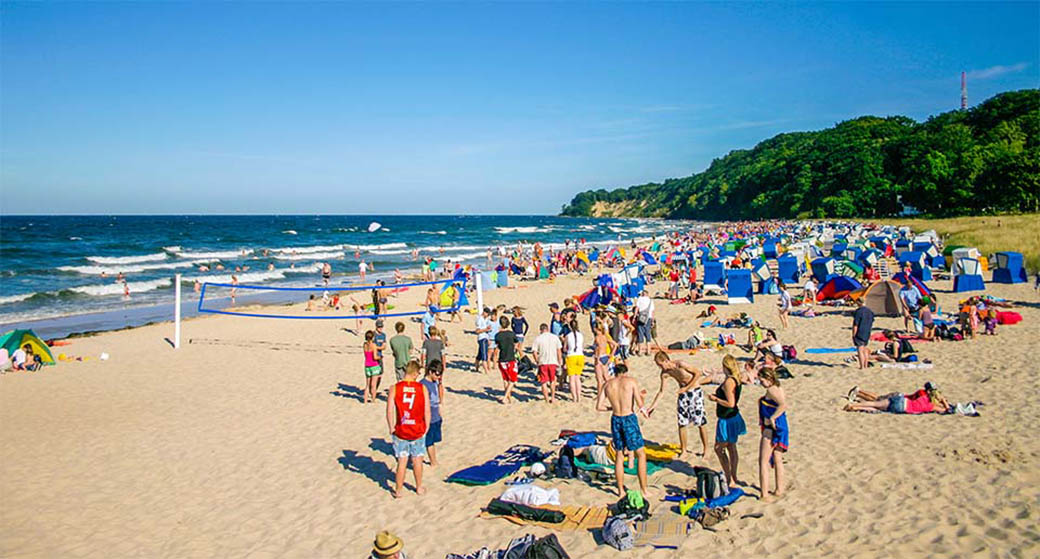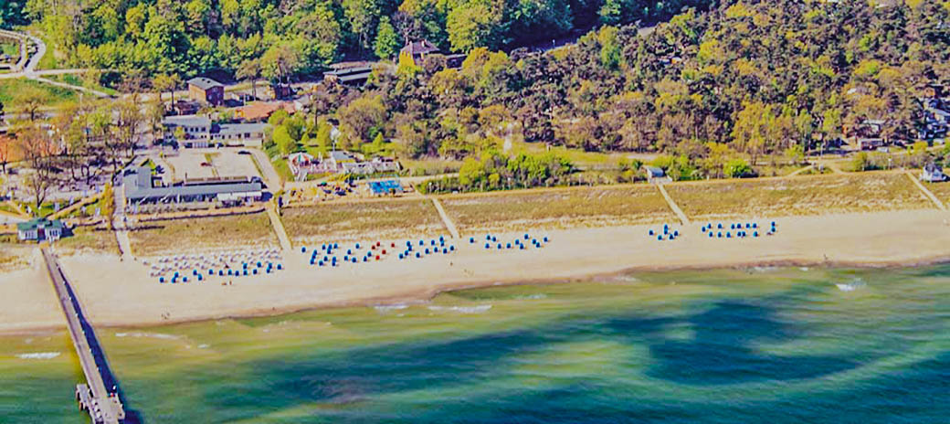 Ein breiter, feinsandiger Strand öffnet die Küste nach Nordosten zur Ostsee. Hinter der Düne die Strandpromenade, durchkreuzt am Kurplatz mit dem Durchgang zur Seebrücke.