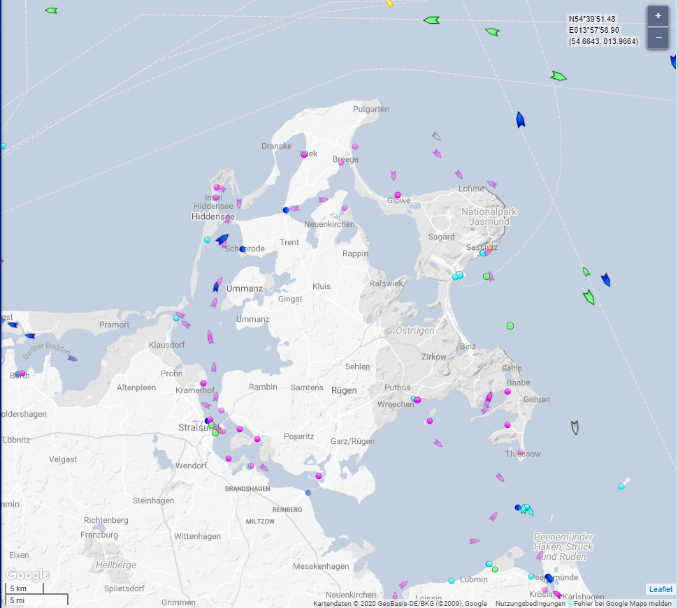 Live Karte mit dem Schiffsverkehr rund Rügen
