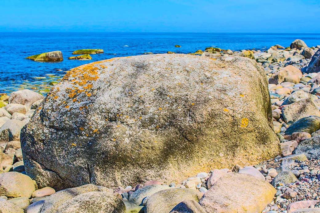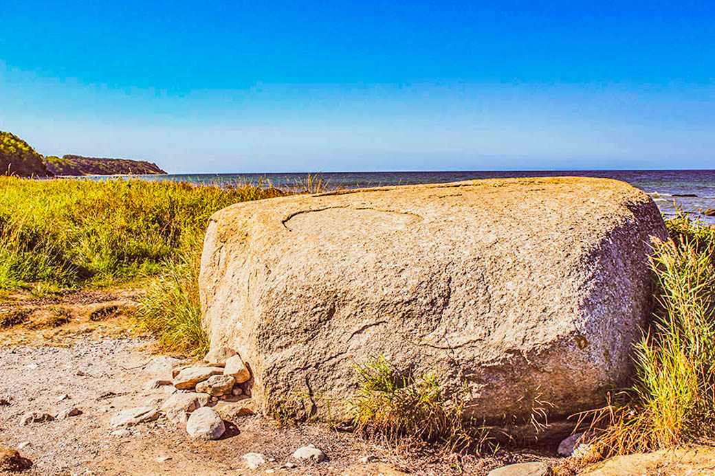 Der Findling Jasmund mit 21 sichtbaren Kubikmetern, liegt am Strand zwischen Kollicker Ort und Kollicker Bach an der Kreideküste im Nationalpark Jasmund.