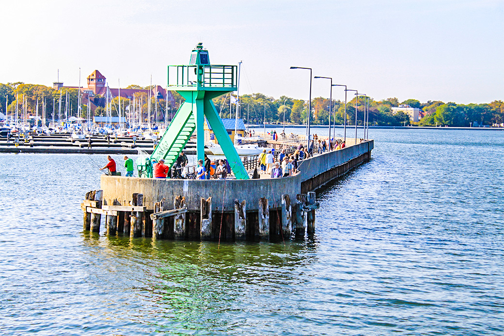 Auf der Mole kann man bis ans Ende mit dem kleinen Leuchtfeuer hinausgehen und den Blick auf den Hafen und Strelasund schweifen lassen.