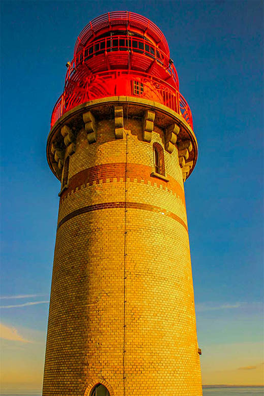 Der neue Leuchtturm im Abendrot mit Blick auf die Bucht der Tromper Wiek.