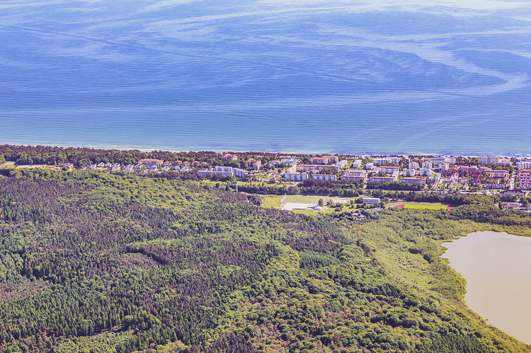 Luftaufnahme von der ehemaligen KDF-Anlage Prora mit den kilometerlang aufgereihten Blöcken direkt an der Ostsee.